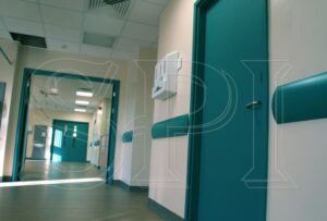 - Повышенной прочностью и износостойкостью. В течение дня дверное полотно в медицинских учреждениях открывается и закрывается тысячи раз. Поэтому оно не должно повреждается при перемещении каталок и другого оборудования. Для изготовления медицинских дверей используют специальный экструзионной ДСП.